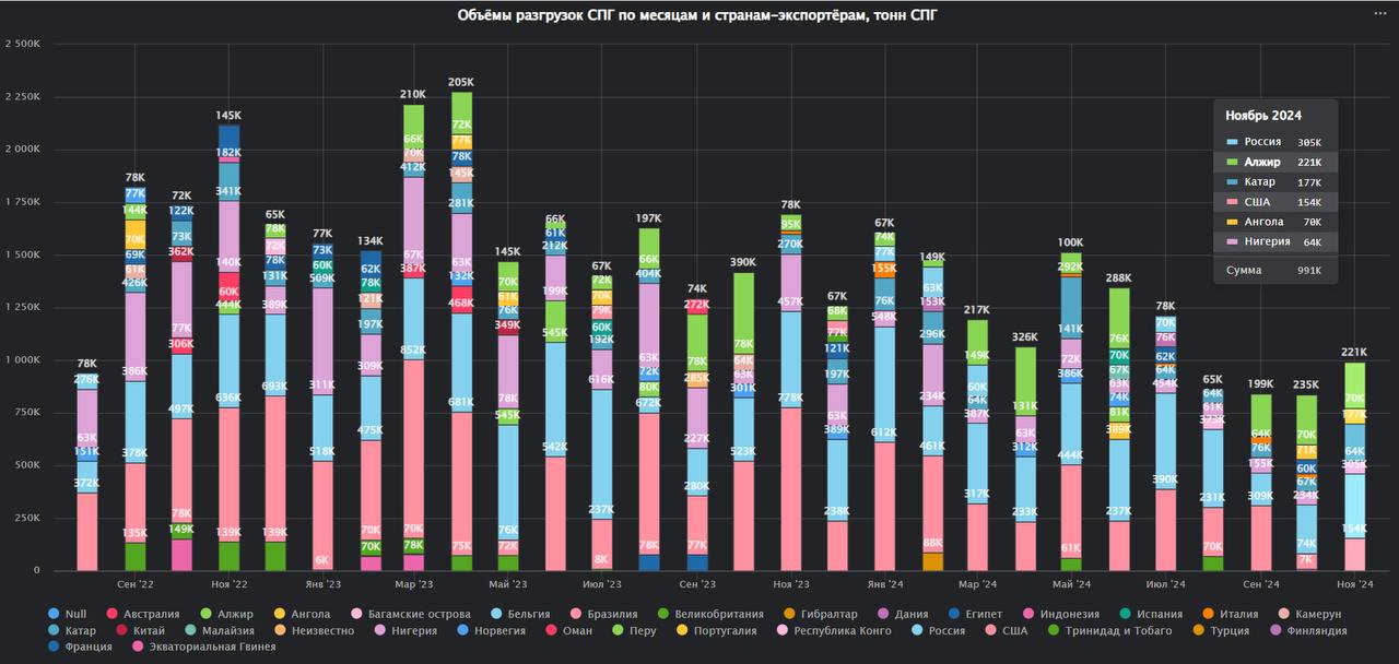 За первые 26 дней ноября Россия напрямую поставила в Испанию 305 тысяч тонн СПГ, что составляет 31% от общего импорта СПГ в Испанию.