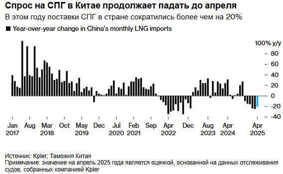Спрос Китая на СПГ снизился, в то время как внутреннее производство и импорт трубопроводного газа, в основном из России, остаются на высоком уровне. Страна также в значительной степени полагается на более дешёвые альтернативы, включая уголь и возобновляемые источники энергии.