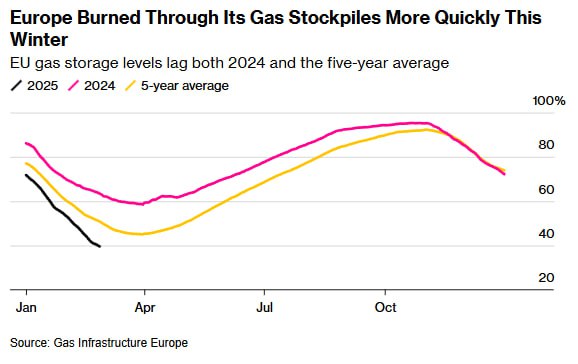 Отопительный сезон в Европе начался 29 октября 2024 г. (на 10 дней раньше, чем в прошлый осенне-зимний сезон), и с этого момента страны ЕС отобрали из хранилищ более 67 млрд куб. м газа. Нетто-отбор составляет около 63,5 млрд куб. м. Наиболее проблемными для ЕС стали 2018 г. и 2022 г., когда запасы в хранилищах к концу отопительного сезона весной опускались до критичных отметок ниже 18% и 26% соответственно