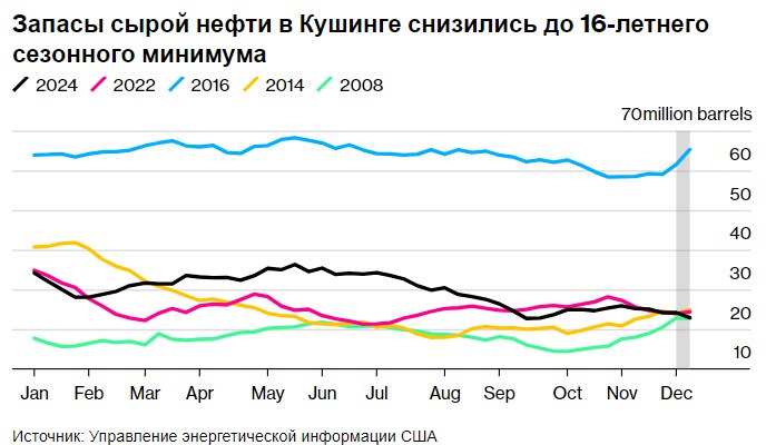 Запасы в Кушинге, штат Оклахома, — пункте поставки фьючерсов на нефть в США — сократились сильнее всего с начала сентября после снижения на 1,3 млн баррелей. Таким образом, они составили всего 22,9 млн баррелей, что является самым низким сезонным показателем с 2008 года. Сокращение импорта из Канады, вероятно, способствовало истощению запасов, которые по всей стране незначительно снизились. Признаки того, что спрос в ближайшей перспективе превысит предложение, также наблюдаются в торговле фьючерсами: в четверг январский контракт на West Texas Intermediate торговался с премией в 49 центов к февральскому контракту.